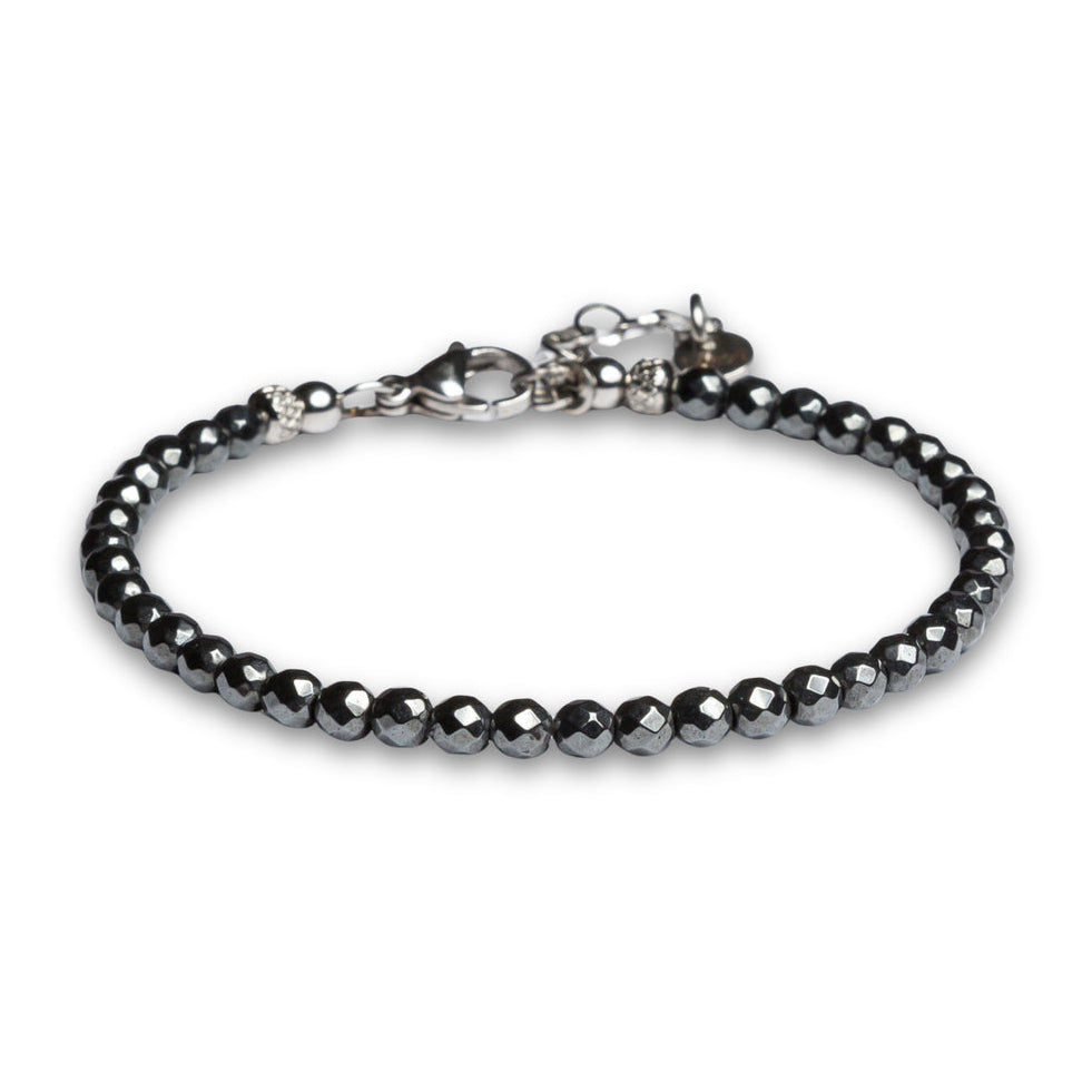L’ematite è un minerale compatto e molto resistente, con una lucidatura metallica che non sbiadisce e mantiene una brillantezza elegante nel tempo. La sua densità la rende piacevole da indossare, stabile e solida al polso.