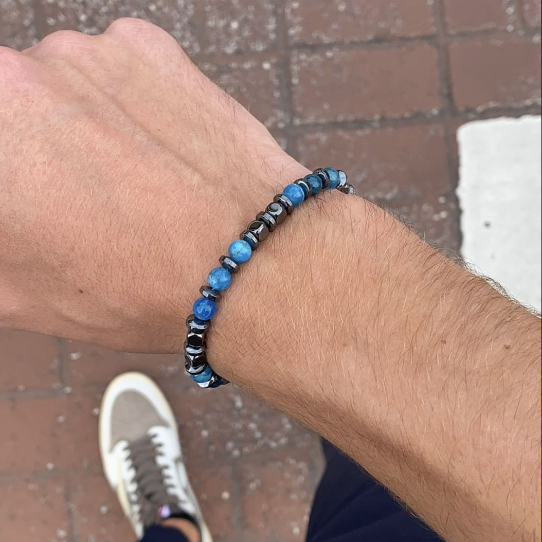 - L’apatite presenta riflessi profondi e cangianti, con venature uniche che la rendono elegante e dinamica.