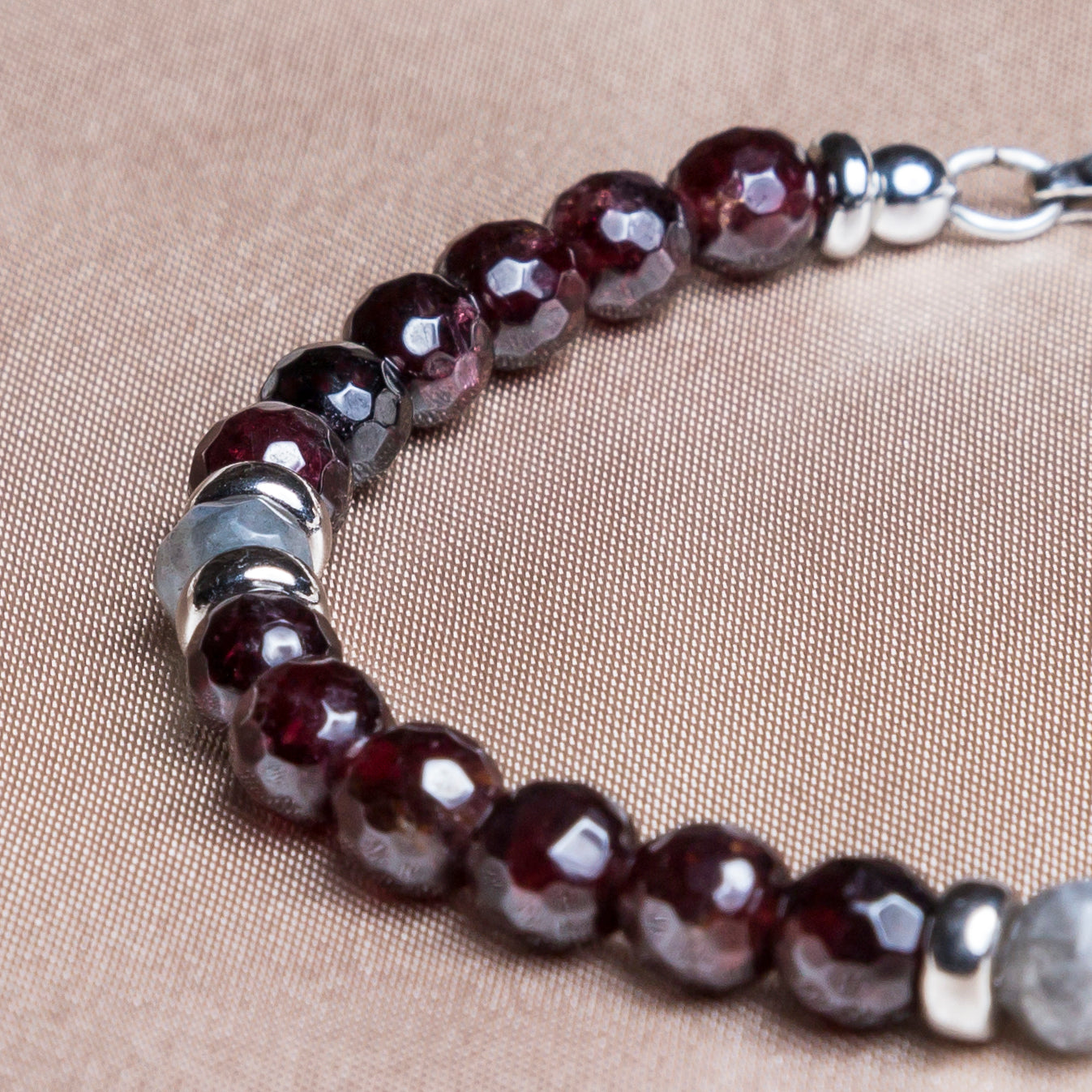 Il bracciale Eclipse combina l’intensità profonda del granato con la lucentezza dell’argento 925 rodiato, metallo nobile che non si ossida e mantiene la sua brillantezza nel tempo.