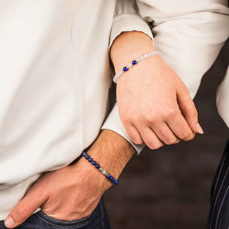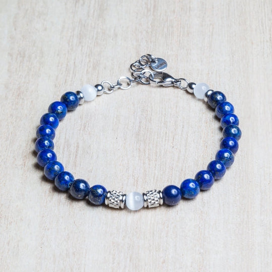 Il Lapislazzuli è associato a chiarezza, verità e comunicazione autentica, mentre l’occhio di gatto è legato a protezione ed equilibrio. Insieme rappresentano armonia tra profondità interiore e stabilità.