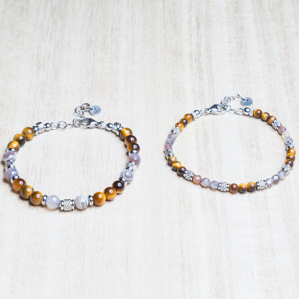 L’agata botswana è associata a equilibrio, calma e stabilità emotiva, mentre l’occhio di tigre richiama forza, determinazione e sicurezza. Insieme creano un’energia che unisce centratura e coraggio.